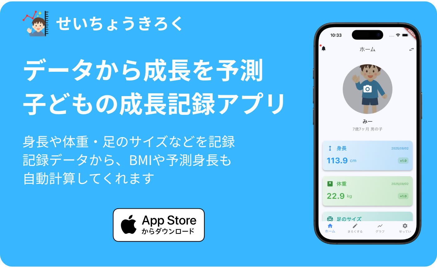 身長や体重・足のサイズなどを記録すると、記録データからBMIや将来的な予測身長も自動計算してくれるアプリです。